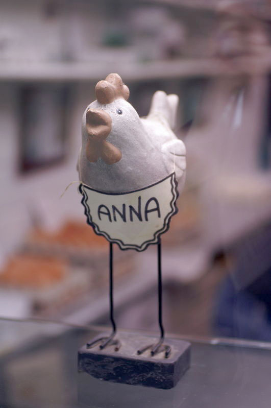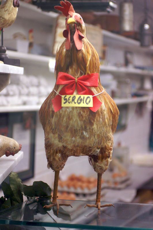 Nearby, I was charmed by the poultry on display in a butcher’s shop: I’m used to seeing chickens displayed with their heads and feet, but not necessarily with names around their necks.