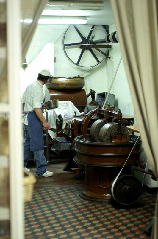 The deeper you are willing to wander into Genoa’s caruggi, or narrow medieval lanes, the greater the rewards. As we entered the Old Town from behind the Palazzo Ducale, I spotted a sign pointing down an alley barely wide enough for a donkey, let alone our tiny Twingo. Lured in by the word cioccolatto, I came across an old door with frosted glass panels and a hand-lettered wooden plate bearing the name Viganotti. Feeling a bit like a trespasser I pushed it open, only to find myself in a child’s fantasy chocolate shop. A rack behind the counter held wicker baskets of filled chocolates, while at the back of the shop a handful of staff toiled over ancient machinery.